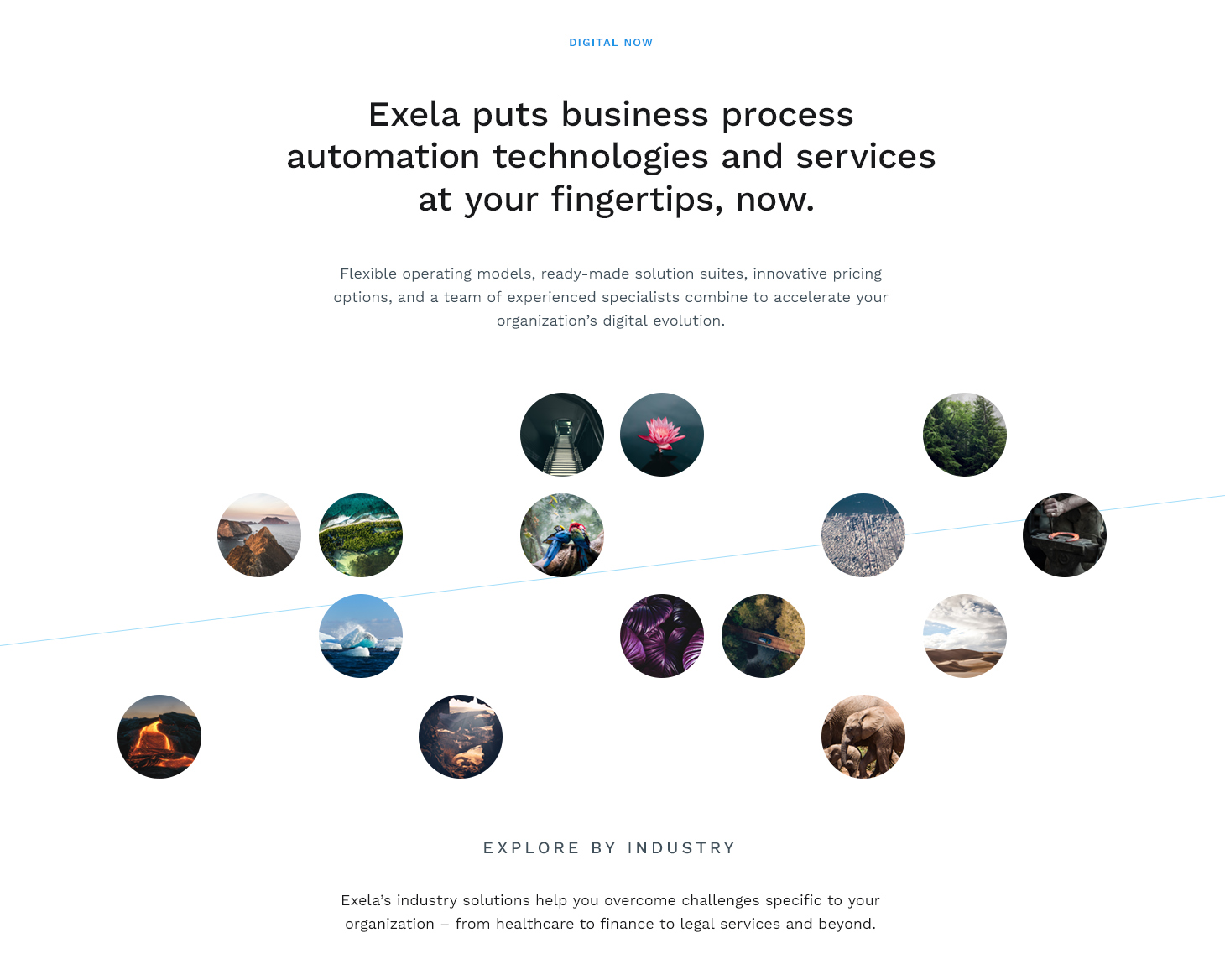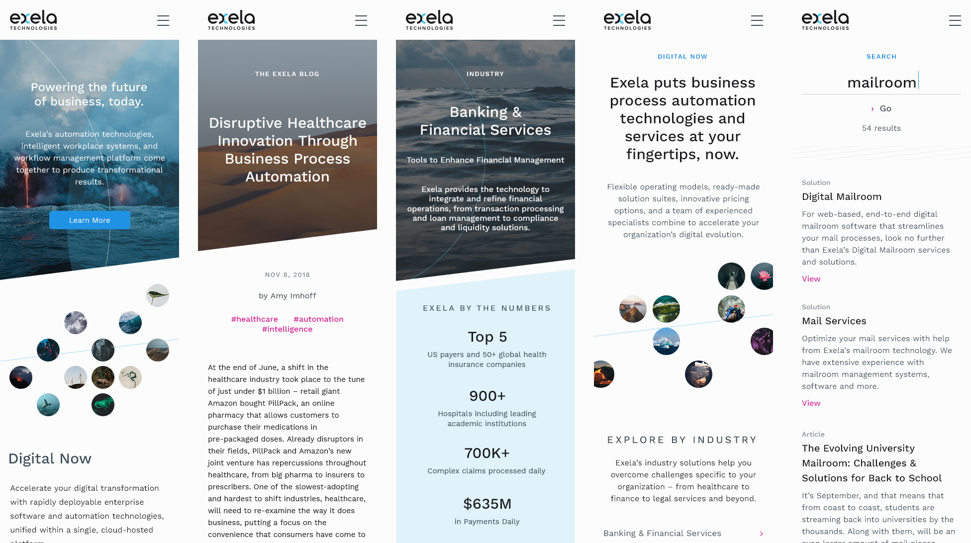 Dramatic, visually-rich photographs of predominantly natural scenes were selected as a foundation for Exela’s marketing image strategy. Such photos are visually-interesting, relatively easy to acquire in large quantities, and can tell a story or convey meaning across a broad topical spectrum. Content categories are assigned a natural theme or biome to provide a conceptual structure for viewers, as well as organizational guidance for Exela's own internal efficiency. The new design system was launched as part of a large-scale website redesign project.